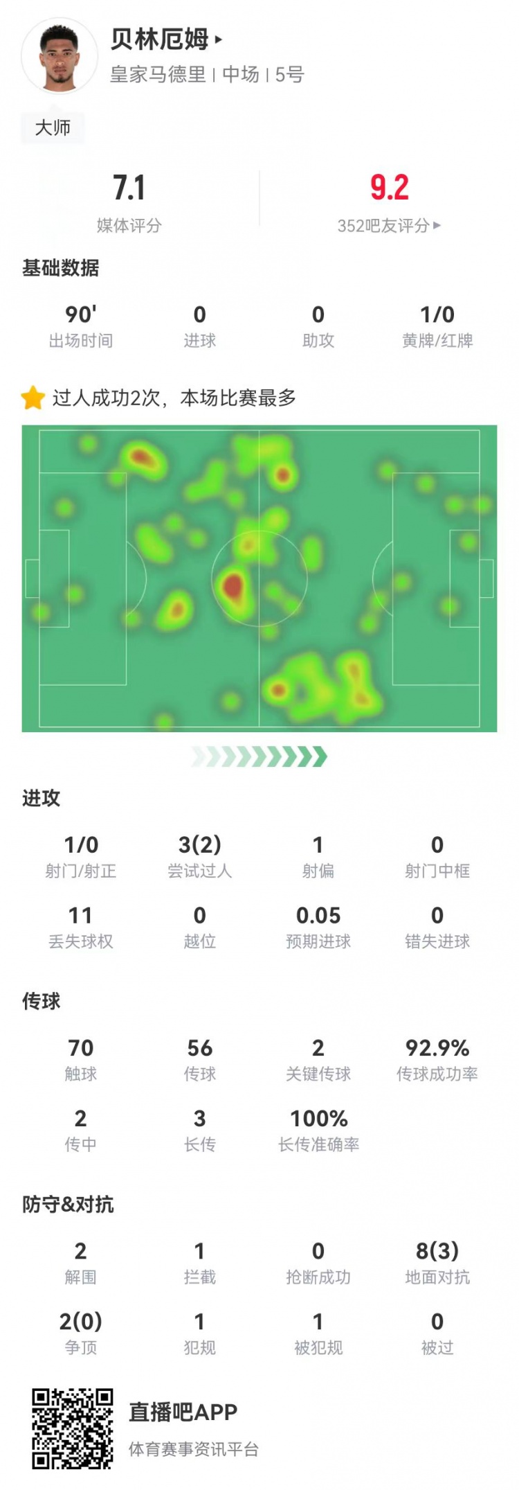 貝林厄姆本場2關鍵傳球+3長傳3成功 10對抗3成功 獲評7.1分