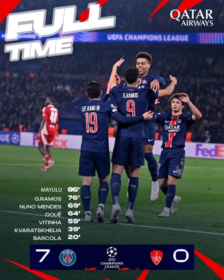 2月20日訊 巴黎在本輪歐冠附加賽次回合7-0血洗布雷斯特,20天內(nèi)完成三殺。