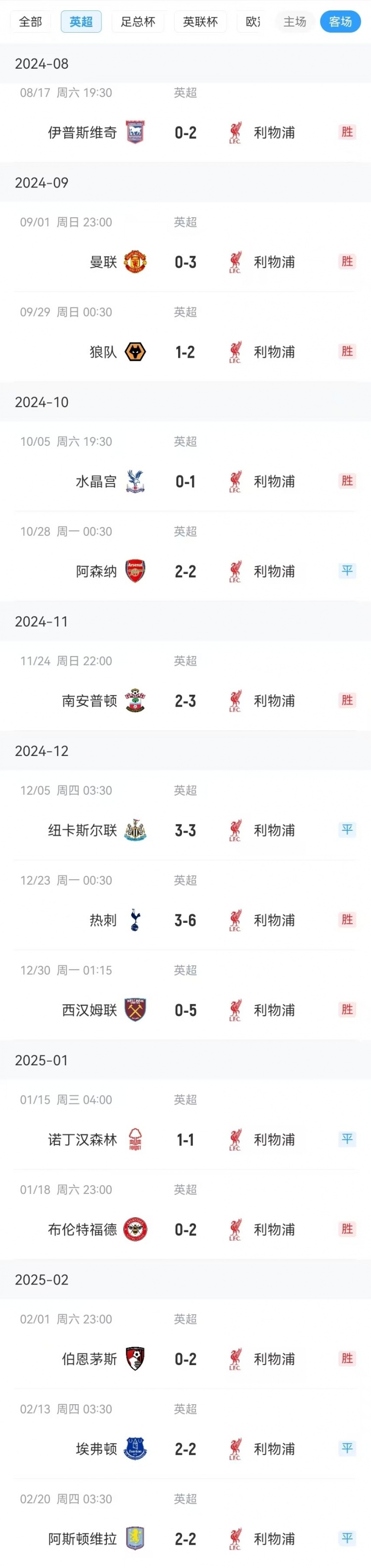 數據統(tǒng)計顯示,利物浦在本賽季共計14個英超客場比賽取得9勝,僅被5次逼平,至今保持不敗。