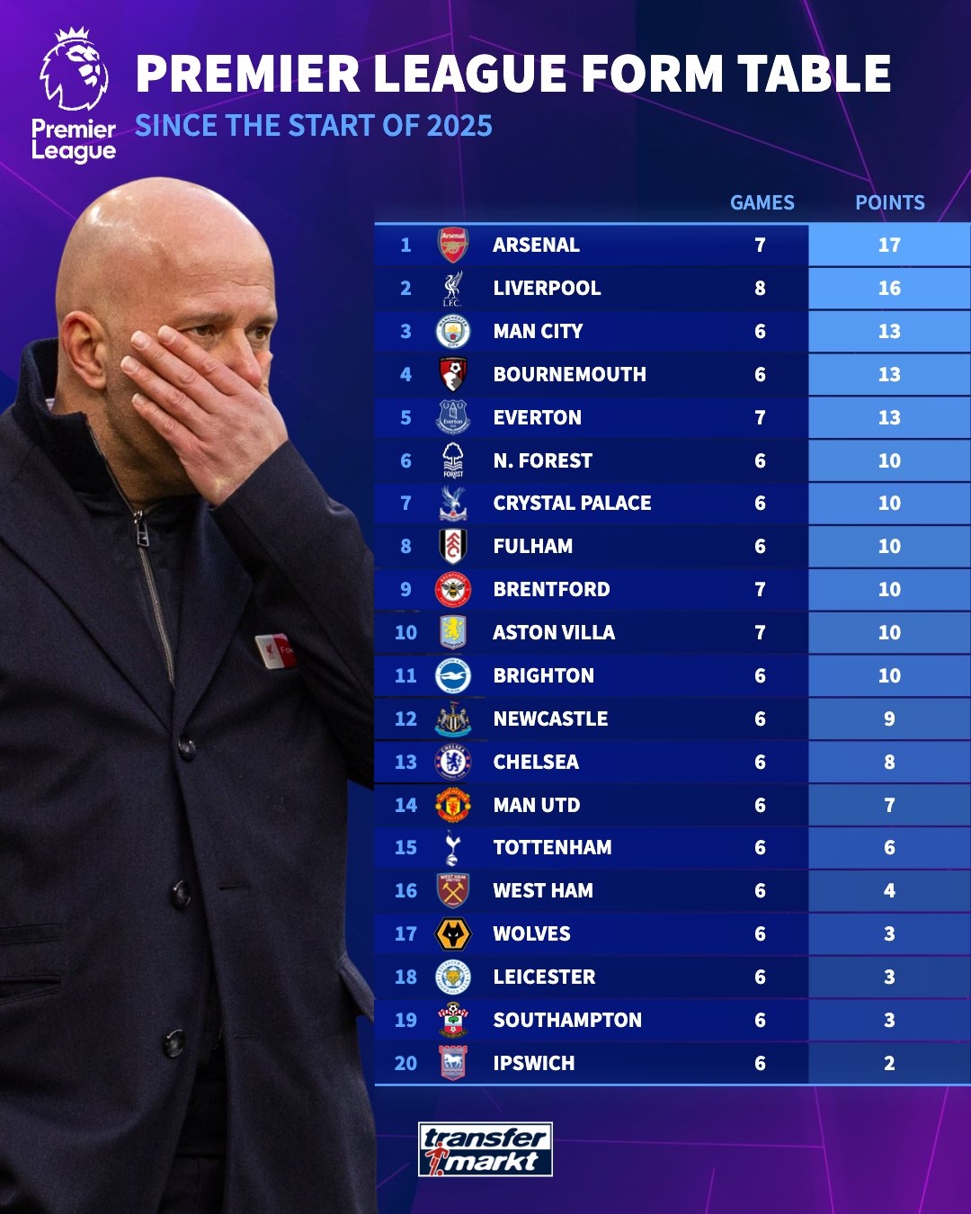 2月20日訊 德國(guó)轉(zhuǎn)會(huì)市場(chǎng)統(tǒng)計(jì)了2025年開始至今英超球隊(duì)拿到的積分,并列出榜單,阿森納17分居首,利物浦16分次席。