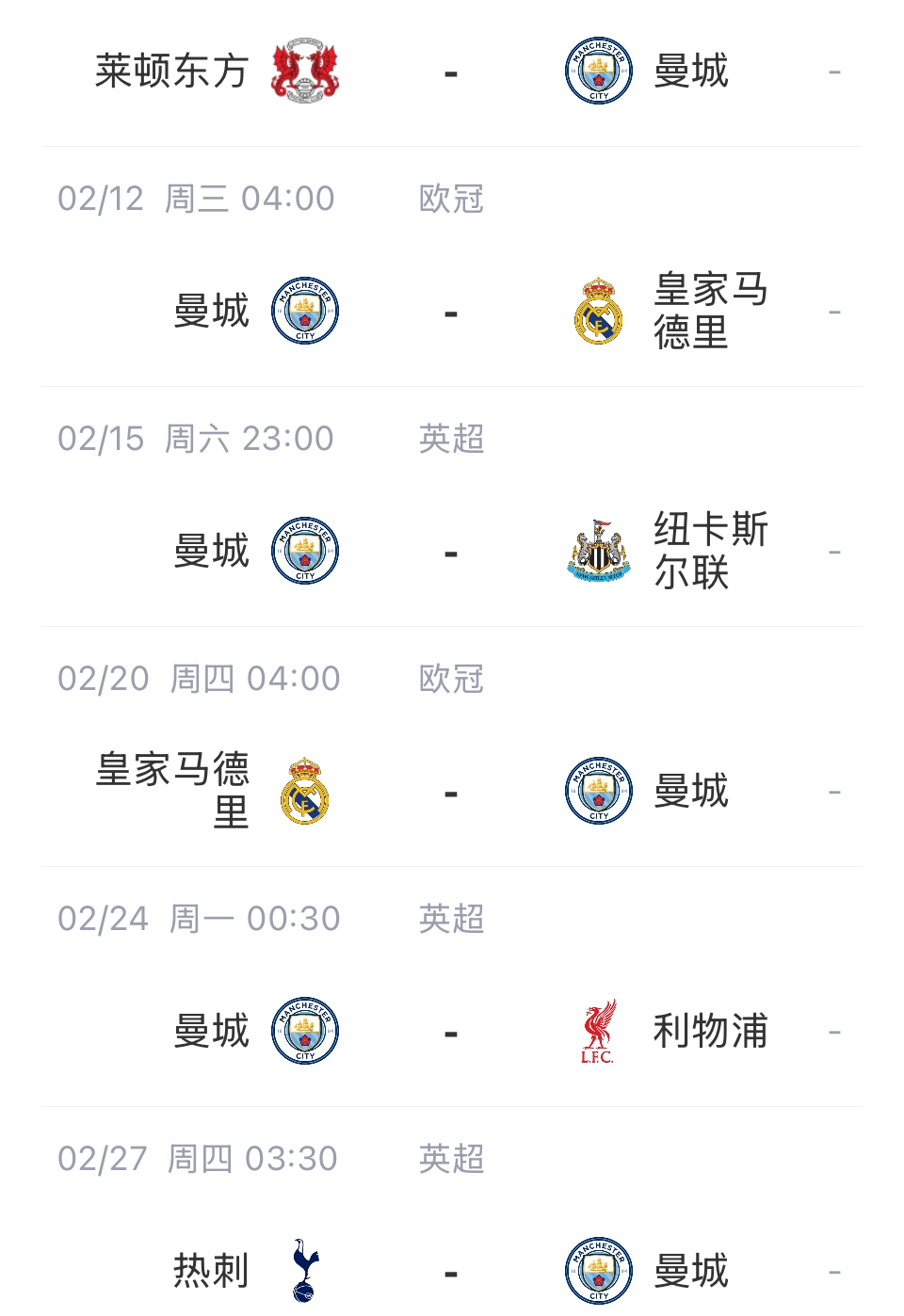 下一場客戰(zhàn)萊頓東方之后,曼城需要先主后客對陣皇馬,在英超賽場還需要對陣紐卡、利物浦、熱刺。