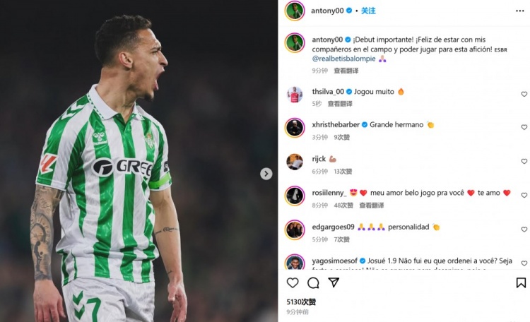 安東尼也在賽后通過社媒曬出慶祝照并配文:“關(guān)鍵的處子秀!很高興能夠和隊(duì)友們一起為眼前的球迷們奮戰(zhàn)。”