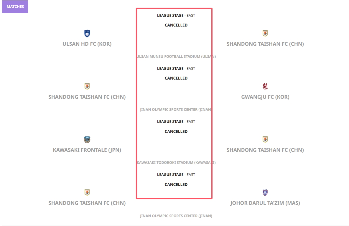 亞足聯(lián)官網(wǎng)顯示:山東泰山8場亞冠全部“取消”!積分榜數(shù)據(jù)清零