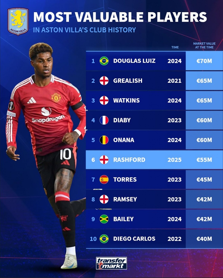 2月3日訊 曼聯(lián)前鋒拉什福德租借加盟維拉,德國轉會市場排出了維拉隊史球員德轉身價排名,拉什福德以5500萬歐排名第6位。