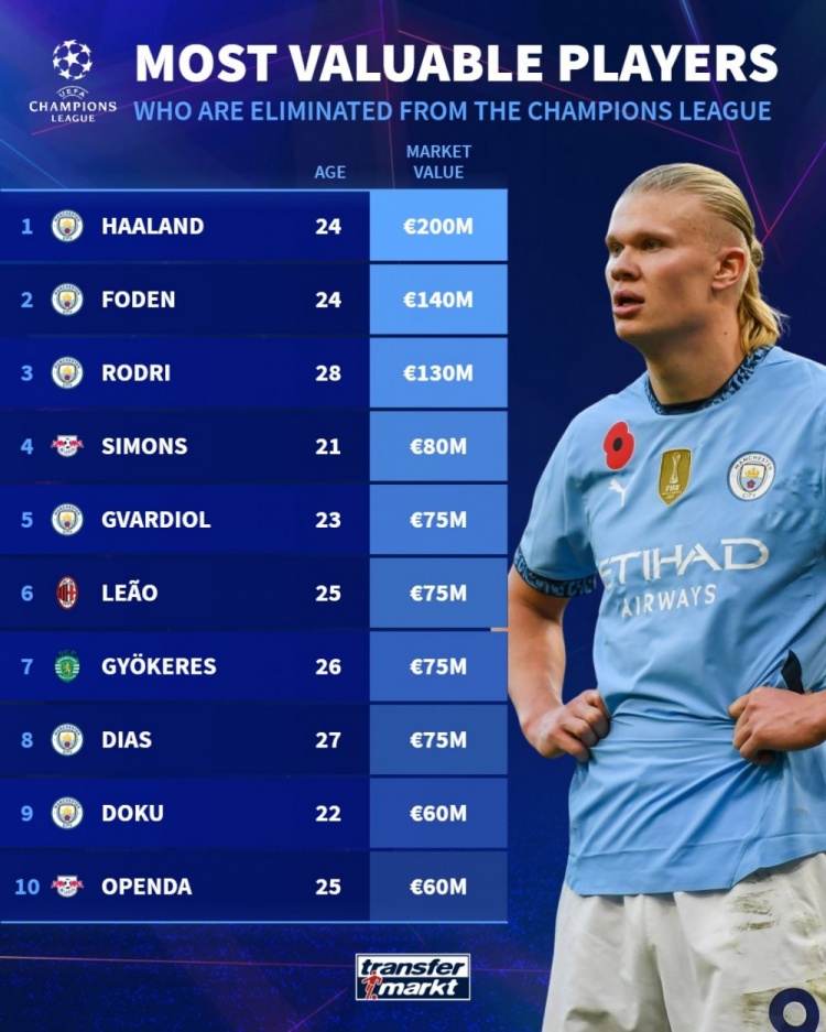 2月20日訊 歐冠淘汰賽附加賽階段比賽戰(zhàn)罷,德國轉會市場列出了歐冠出局球員身價排名,哈蘭德2億歐居首,曼城包攬前3名,前10占6席。