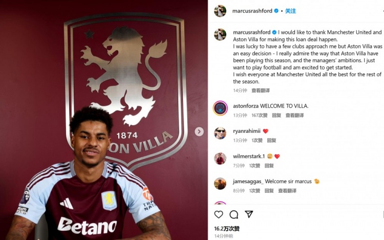 2月3日訊 維拉已經(jīng)官宣租借引進曼聯(lián)前鋒拉什福德,后者也通過社媒發(fā)文。