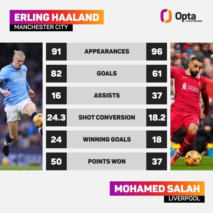 2月21日訊 OPTA統(tǒng)計(jì)了薩拉赫和哈蘭德過去三個賽季的進(jìn)球數(shù)據(jù),兩人都在英超參與了98個進(jìn)球,分別為曼城和利物浦贏得50分和37分。