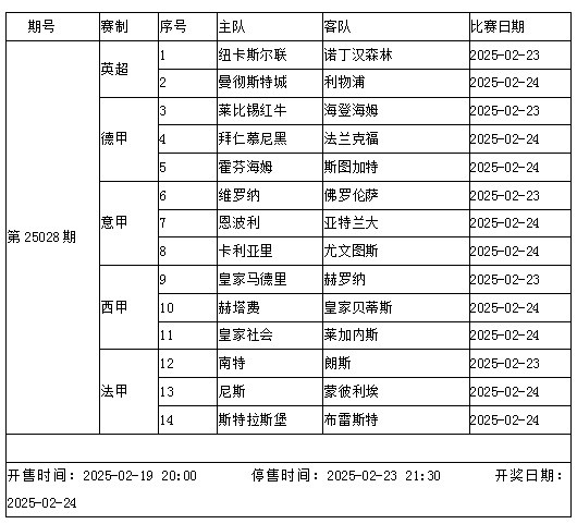 傳足勝負(fù)彩第25028期競猜賽事涵蓋五大聯(lián)賽,其中英超曼城VS利物浦是全歐關(guān)注的焦點(diǎn),此外拜仁、尤文和皇馬等豪門也將陸續(xù)出戰(zhàn)。