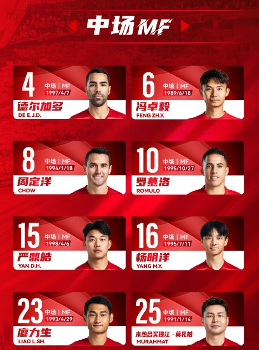 中場:4-德爾加多、6-馮卓毅、8-周定洋、10-羅慕洛、15-嚴鼎皓、16-楊明洋、23-廖力生、25-木熱合買提江-莫扎怕、20-木塔力甫-依明卡日、39-甘超、58-廖榮祥