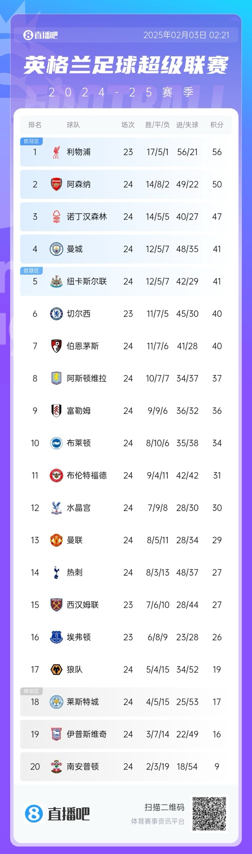 英超第24輪,利物浦2-0伯恩茅斯,諾丁漢森林7-0布萊頓,曼聯(lián)0-2不敵水晶宮,阿森納5-1曼城。最新英超積分榜形勢(shì): 標(biāo)簽: 足球 英超 阿森納 利物浦 曼城 曼聯(lián) 諾丁漢森林