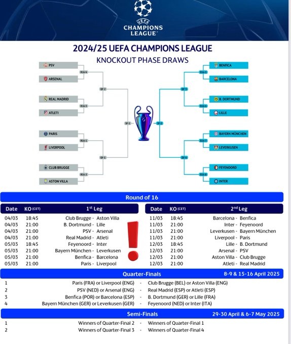 2月22日訊 24/25賽季歐冠淘汰賽賽程出爐,1/8決賽首回合將在3月5日凌晨開(kāi)戰(zhàn)。