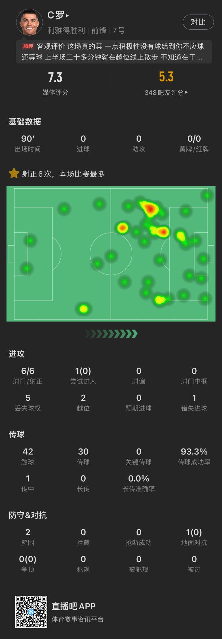 2月22日訊 沙特聯(lián)賽第21輪,利雅得勝利主場2-3不敵達(dá)曼協(xié)作,先賽距榜首8分。本場比賽C羅出戰(zhàn)首發(fā)打滿全場,沒有取得進(jìn)球或助攻,媒體評(píng)分獲得了7.3分。