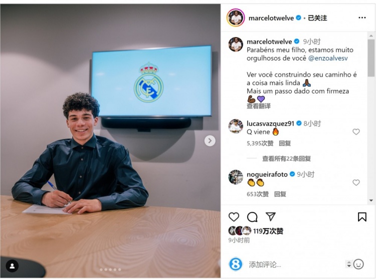 馬塞洛15歲兒子恩佐與皇馬續(xù)約,馬塞洛在社交媒體上曬出恩佐簽字的照片,配文:“祝賀你,我的兒子,我們?yōu)槟愀械津湴??!?/p>