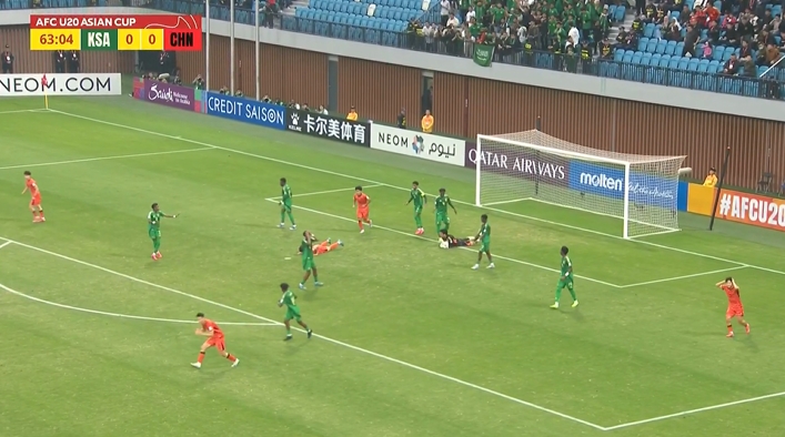 02月22日訊 U20亞洲杯1/4決賽,中國vs沙特,比賽第63分鐘,王鈺棟遠(yuǎn)射被撲,毛偉杰停球橫傳,劉誠宇無人盯防推射踢呲。