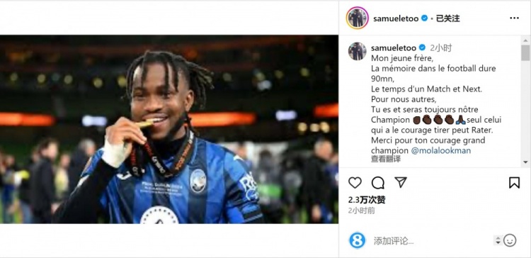 非洲足壇名宿、喀麥隆足協(xié)主席埃托奧社媒發(fā)文,鼓勵(lì)盧克曼(尼日利亞前鋒),他寫道:“我的小老弟,在足球世界里記憶只存留90分鐘,這是一場(chǎng)比賽的時(shí)間,然后就是下一場(chǎng)?!?/p>