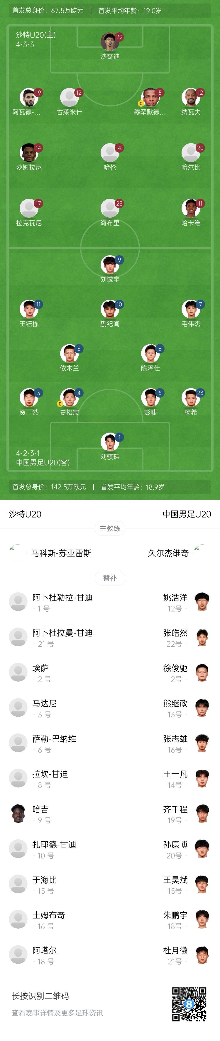 沙特U20首發(fā):22-哈米德-優(yōu)素福、4-沙特-哈倫、5-穆罕默德-巴爾納維、12-納瓦夫-吳萊米什、19-阿瓦德-阿曼、13-巴薩姆-哈扎齊、14-費(fèi)爾哈赫-沙姆拉尼、20-阿卜杜勒馬利克-哈爾比、11-薩阿德-哈卡維、17-侯賽因-拉克瓦尼、23-薩米爾-海巴里
