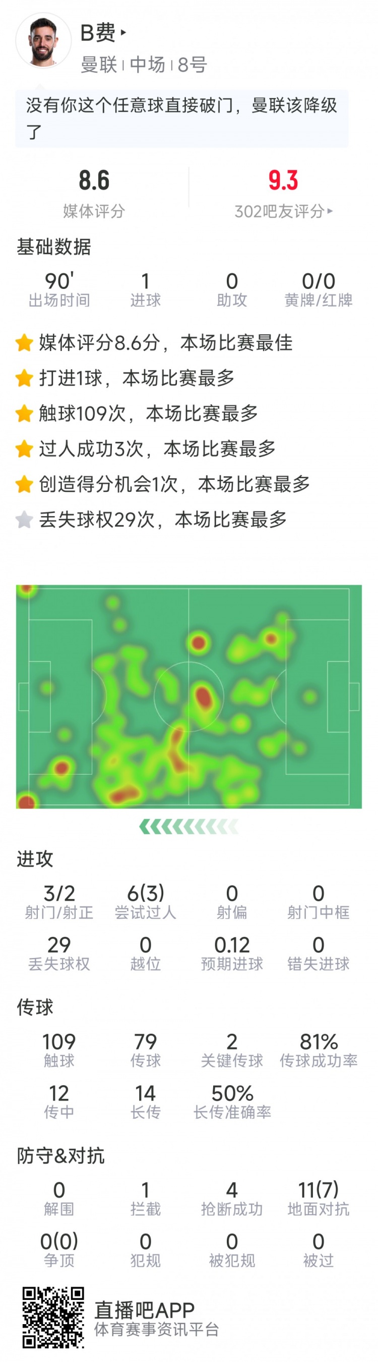 2月22日訊 在本輪英超,曼聯(lián)2-2戰(zhàn)平埃弗頓。本場比賽B費打進任意球,以下為他在本場數(shù)據(jù):