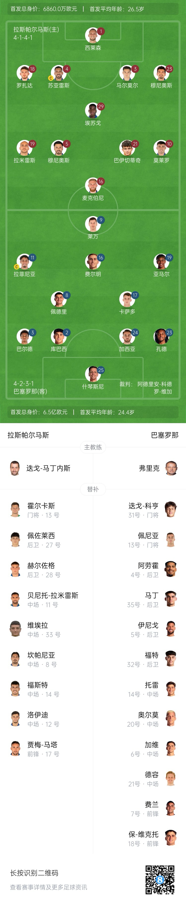 巴薩首發(fā):25-什琴斯尼、2-庫(kù)巴西、3-巴爾德、23-孔德、24-埃里克-加西亞、8-佩德里、16-費(fèi)爾明、17-卡薩多、11-拉菲尼亞、19-亞馬爾、9-萊萬