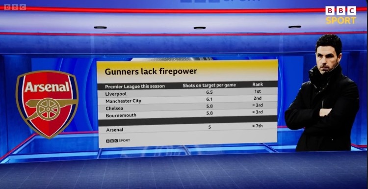 BBC也盤點(diǎn)了本賽季英超球隊(duì)場均射正次數(shù)榜,利物浦6.5次居首,曼城6.1次第二,切爾西與伯恩茅斯5.8次并列第三,而阿森納5次僅能夠并列排在第7。