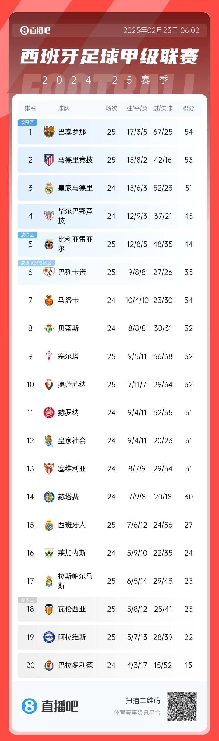 02月23日訊 西甲第25輪,巴薩2-0客勝拉斯帕爾馬斯,先賽1分優(yōu)勢(shì)領(lǐng)跑。