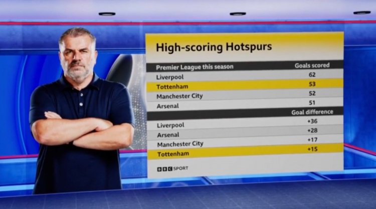 根據(jù)BBC統(tǒng)計(jì),熱刺本賽季英超打進(jìn)53球排名第二,目前僅次于打進(jìn)62球的利物浦。在凈勝球方面,熱刺+15排名英超第四位,僅次于利物浦、阿森納、曼城。