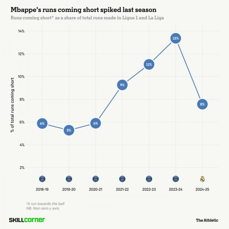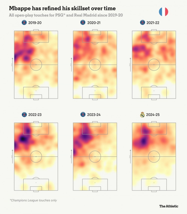 姆巴佩向更傳統(tǒng)的中鋒演變,則是在他轉(zhuǎn)會(huì)到皇馬之后,進(jìn)入了快車(chē)道。