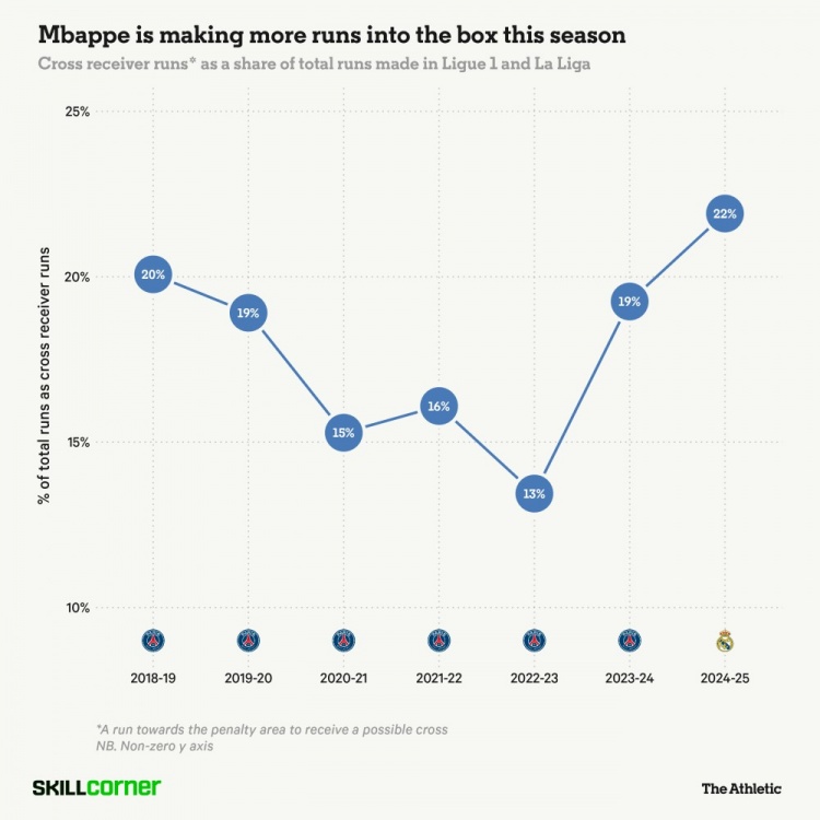 本賽季,姆巴佩更多地進(jìn)入禁區(qū)進(jìn)行跑位