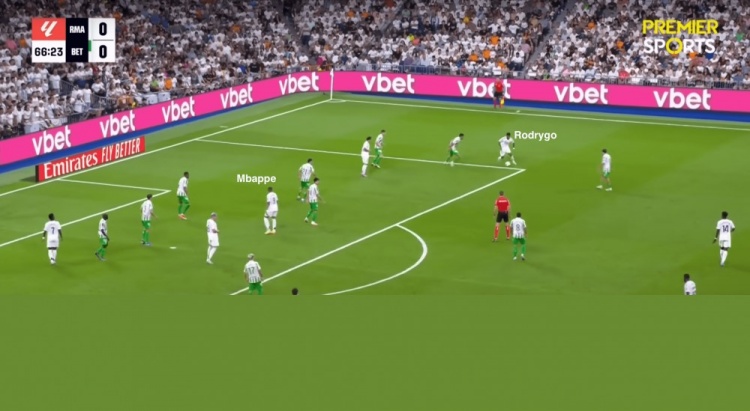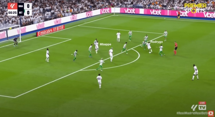 當(dāng)羅德里戈從右路帶球內(nèi)切之時(shí),姆巴佩背對(duì)著球門(mén),以便更好地創(chuàng)造進(jìn)攻空間……