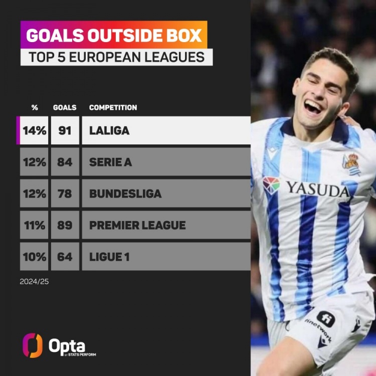 2月24日訊 根據(jù)Opta的數(shù)據(jù),西甲本賽季649粒進球中有91粒來自于禁區(qū)外,占比14%是五大聯(lián)賽最多的。