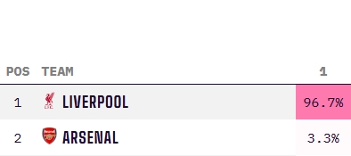 穩(wěn)了??利物浦最新英超奪冠概率高達(dá)96.7%,阿森納3.3% 曼城歸0