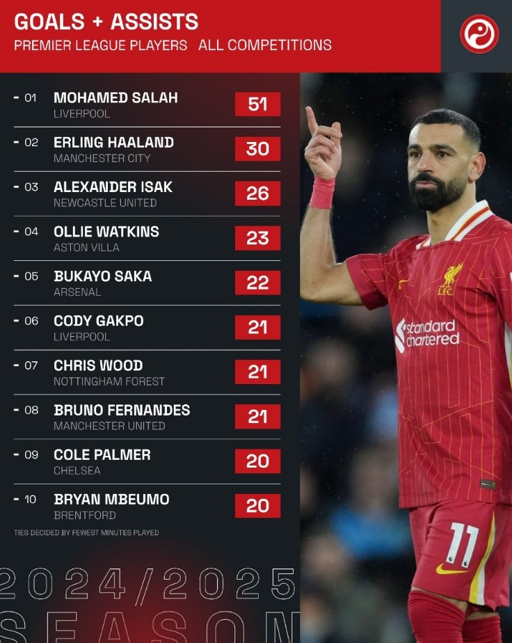 2月24日訊 數(shù)據(jù)網(wǎng)站Squawka盤點了本賽季至今英超球員在各項賽事中參與進球榜(進球+助攻),其中薩拉赫51球遙遙領(lǐng)先,以下為具體榜單: