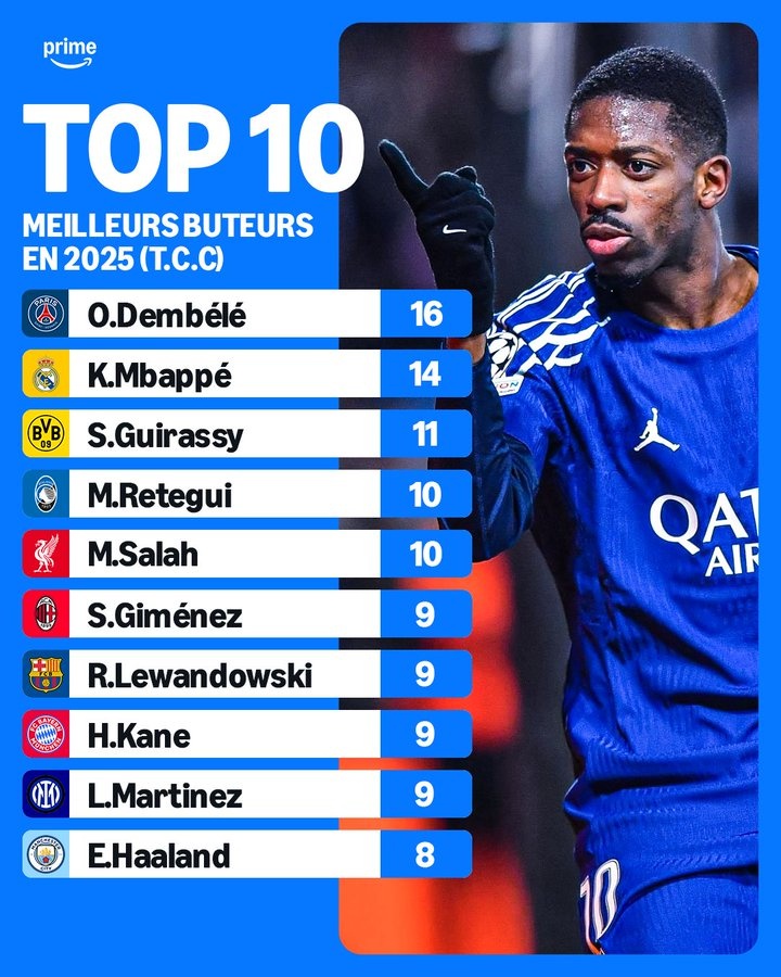 2月24日訊 亞馬遜Prime盤點(diǎn)了2025年五大聯(lián)賽射手榜,登貝萊16球排名第一。