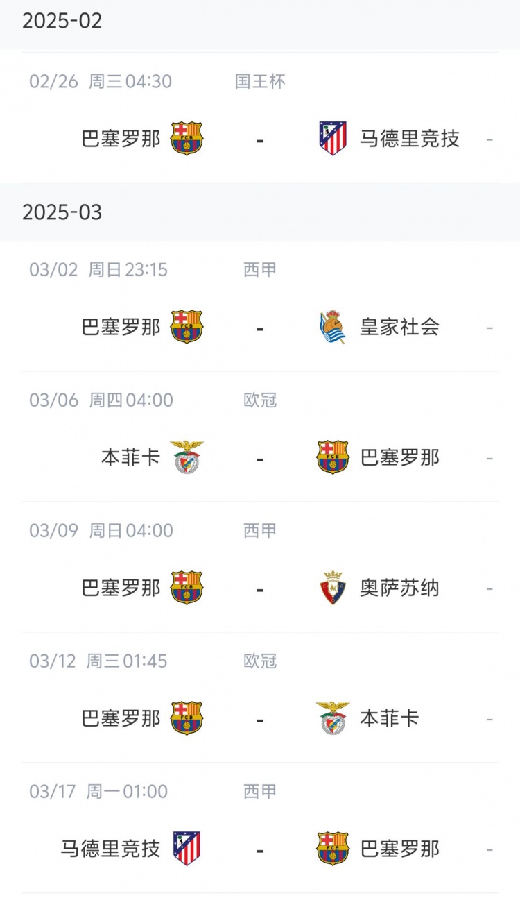 2月24日訊 未來三周,巴薩、皇馬和馬競將迎來一系列關鍵賽事?!睹咳阵w育報》報道,巴薩的賽程相對較為有利,六場比賽中將有四場主場作戰(zhàn)。