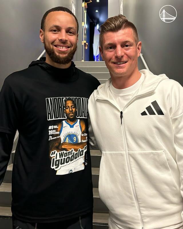 克羅斯現(xiàn)場看勇士vs獨行俠&伊戈達(dá)拉球衣退役儀式,賽后合影庫里