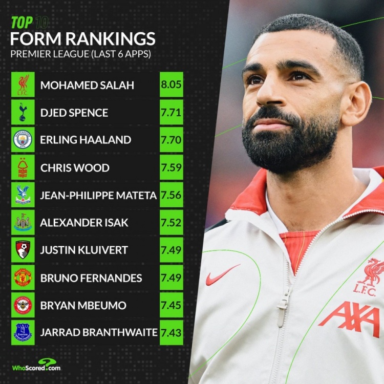 whoscored英超近期狀態(tài)榜: