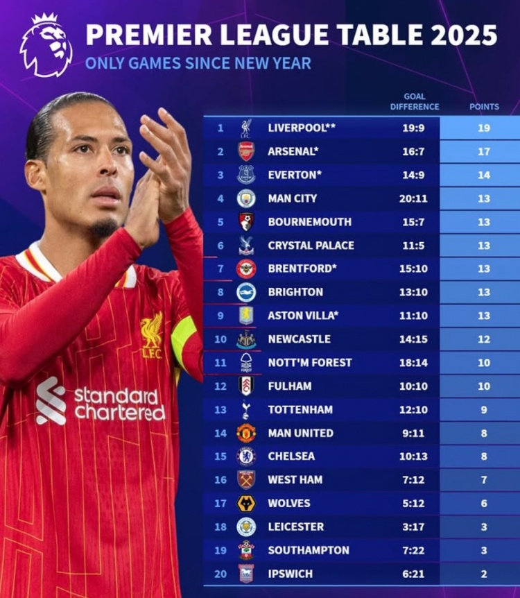 2月26日訊 《轉(zhuǎn)會(huì)市場(chǎng)》統(tǒng)計(jì)了2025年英超聯(lián)賽積分榜情況,利物浦壓阿森納居首。