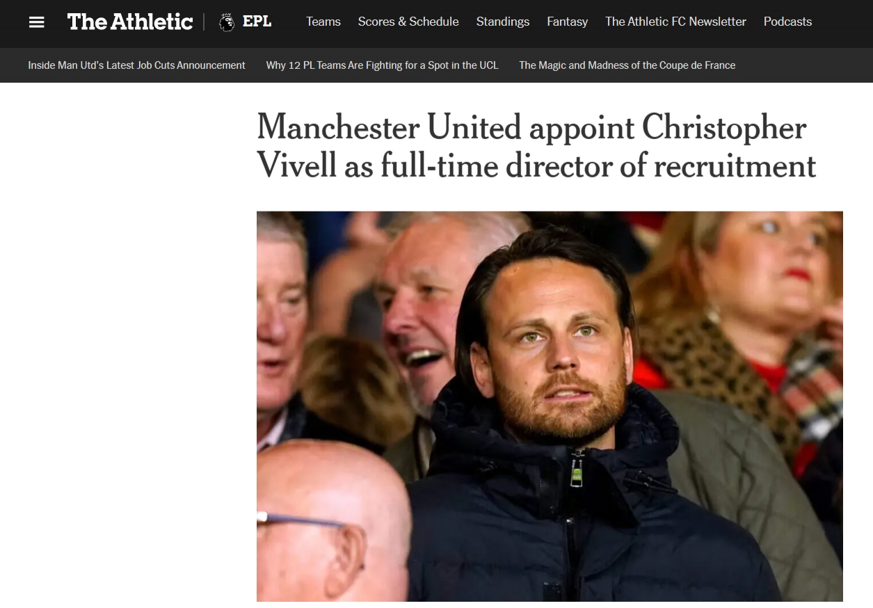 2月25日訊 據(jù)《Theathletic》報道,曼聯(lián)任命克里斯托弗-維維爾(Christopher Vivell)為全職招聘總監(jiān),此前他曾臨時擔任該職位。