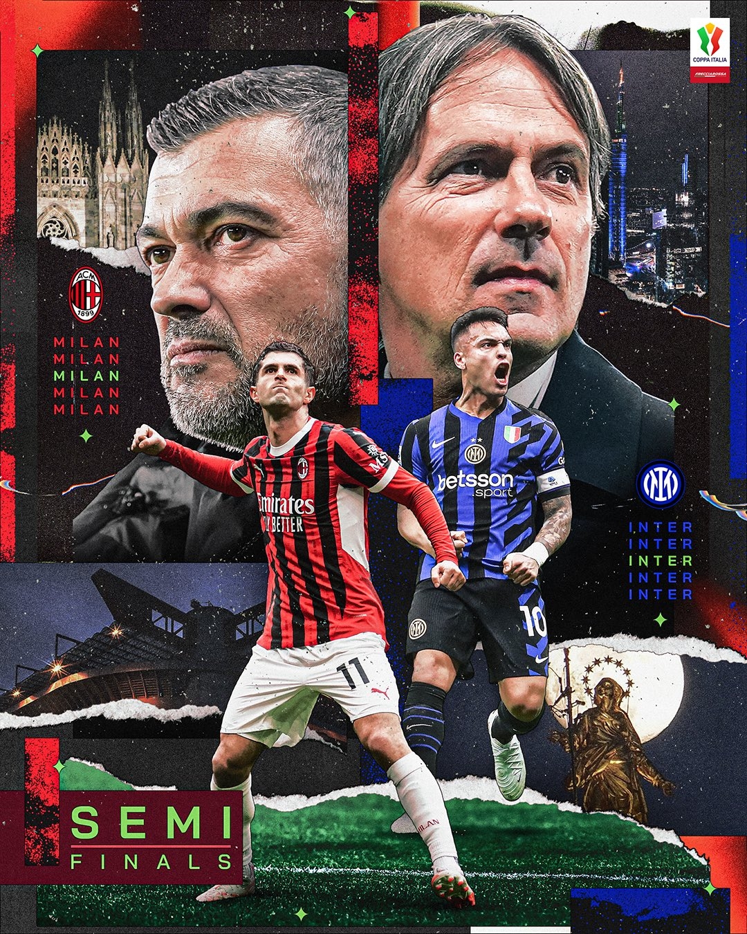 國(guó)米半決賽的對(duì)手將是AC米蘭,官方也曬出海報(bào)為這場(chǎng)米蘭德比預(yù)熱,海報(bào)中兩隊(duì)主帥小因扎吉、孔塞桑,以及普利西奇、勞塔羅出鏡。
