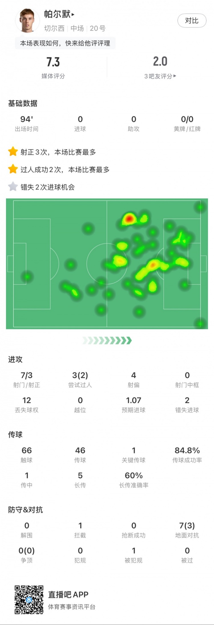 2月26日訊 本輪英超,切爾西4-0圣徒,帕爾默全場數(shù)據(jù):