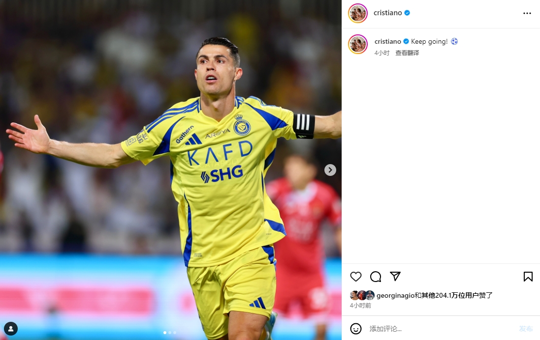 2月26日訊 在今天凌晨結(jié)束的沙特聯(lián)賽中,利雅得勝利在客場(chǎng)2-0戰(zhàn)勝了麥加統(tǒng)一。C羅賽后在社媒上曬出了自己的比賽照片,并配文“繼續(xù)努力”。