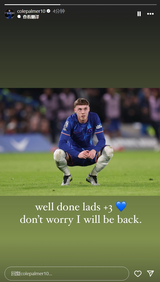 本場比賽帕爾默首發(fā)出戰(zhàn),賽后他也在個人社媒曬出本場照片,配文寫道:“干得漂亮,伙計們,拿下三分!不用擔(dān)心,我會回來的?!?/p>
