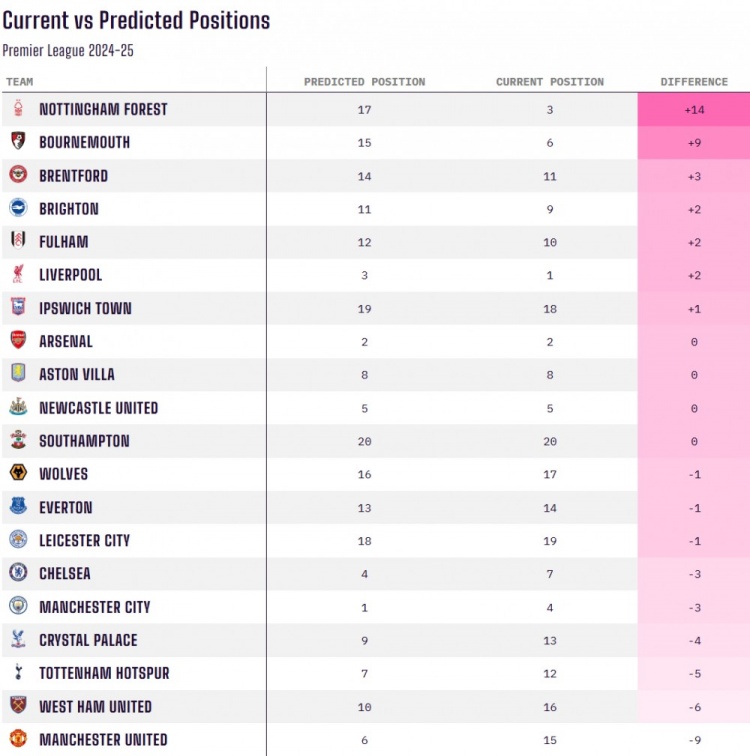 2月26日訊 OPTA對比了當(dāng)前英超排名和賽季之初的預(yù)測排名的情況,諾丁漢森林表現(xiàn)最佳、曼聯(lián)最令人失望。