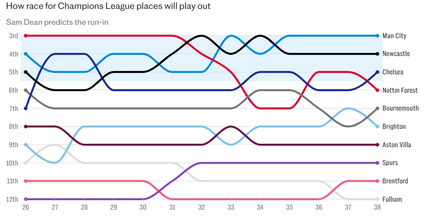 02月26日訊 英超有望在下賽季獲得5個歐冠席位,《每日電訊報》撰文對最后排在前5的球隊進行了預測。曼城、紐卡、切爾西將排在三四五名。