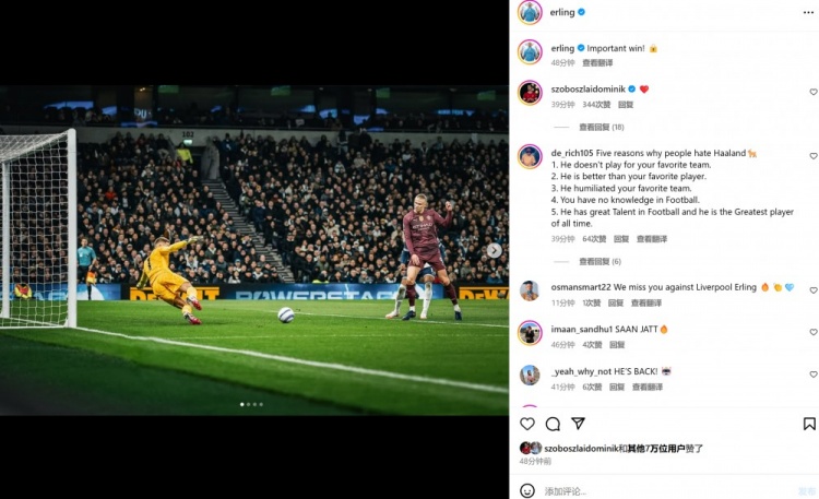 2月27日訊 在本輪英超,曼城1-0小勝熱刺。本場比賽哈蘭德打進(jìn)唯一進(jìn)球,賽后他也在個人社媒曬出本場破門瞬間照片,配文寫道:“拿下一場重要的勝利!” 標(biāo)簽: 足球 英超 曼城