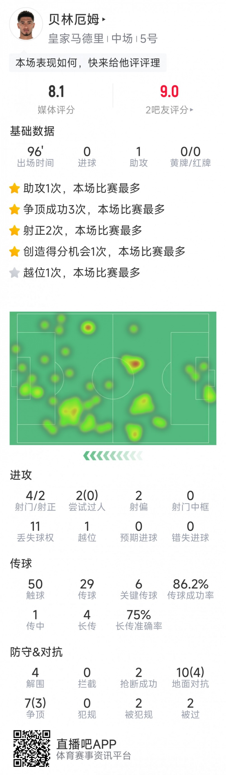 2月27日訊 在國王杯半決賽,皇馬1-0擊敗皇家社會(huì),,貝林厄姆送出助攻,以下為他在本場數(shù)據(jù):