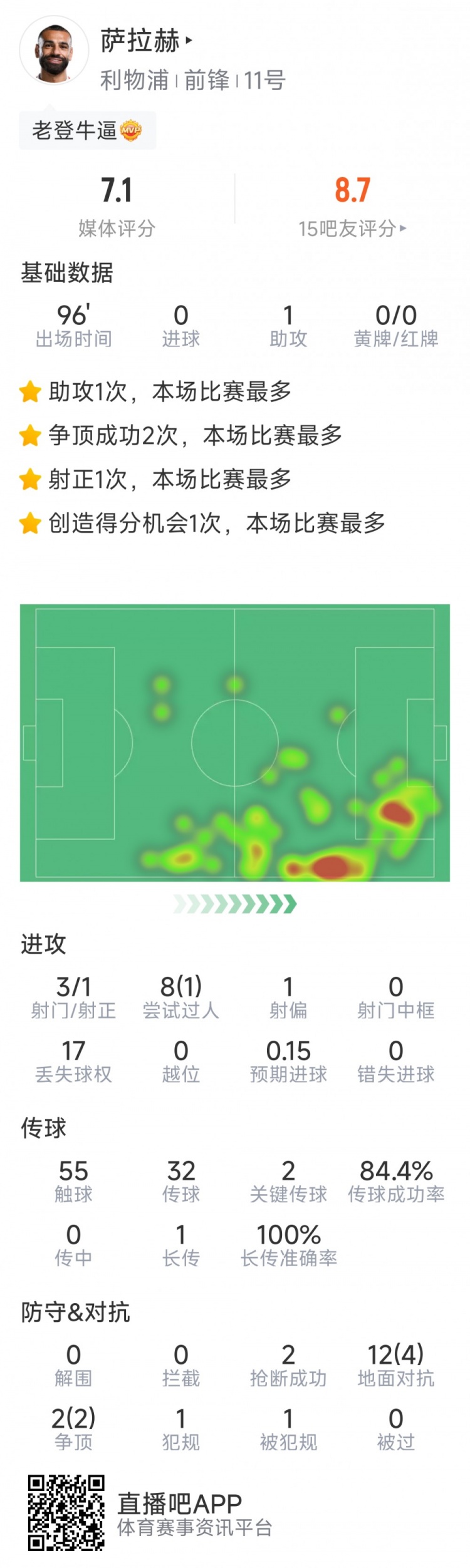 2月27日訊 在本輪英超,利物浦2-0擊敗紐卡,以下為薩拉赫本場數(shù)據(jù):