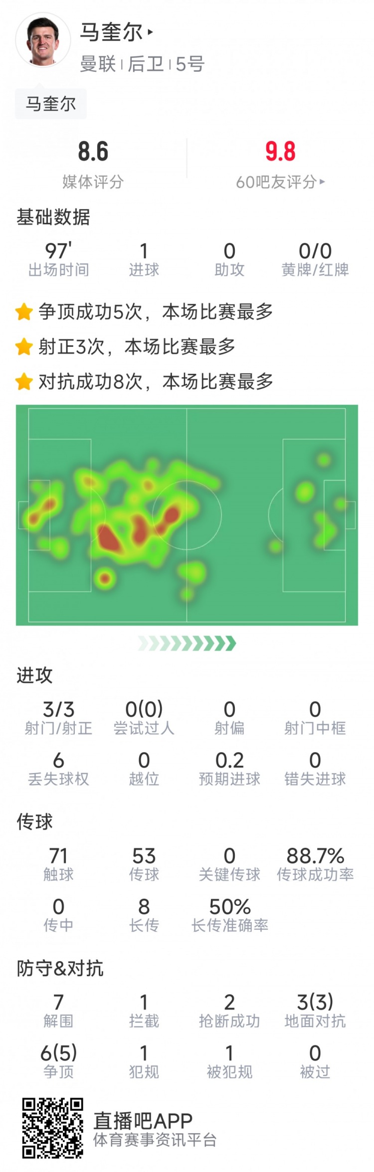 2月27日訊 在本輪英超,曼聯(lián)3-2擊敗伊普斯維奇。馬奎爾打進關(guān)鍵進球,以下為他在本場數(shù)據(jù):
