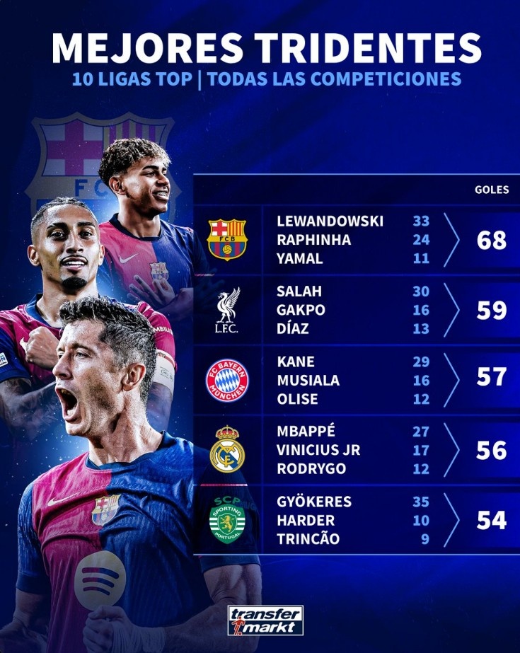 2月27日訊 德轉(zhuǎn)盤(pán)點(diǎn)了本賽季歐洲前十聯(lián)賽各項(xiàng)賽事進(jìn)球最多鋒線三叉戟,其中巴薩三將以68球領(lǐng)跑,具體如下: