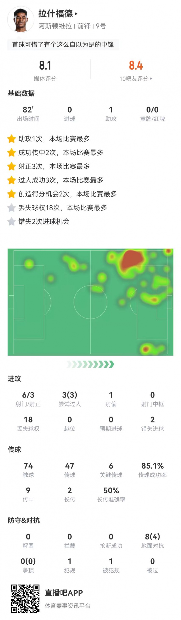 3月1日訊 維拉在本輪足總杯2-0擊敗卡迪夫城,拉什福德本場數(shù)據如下: