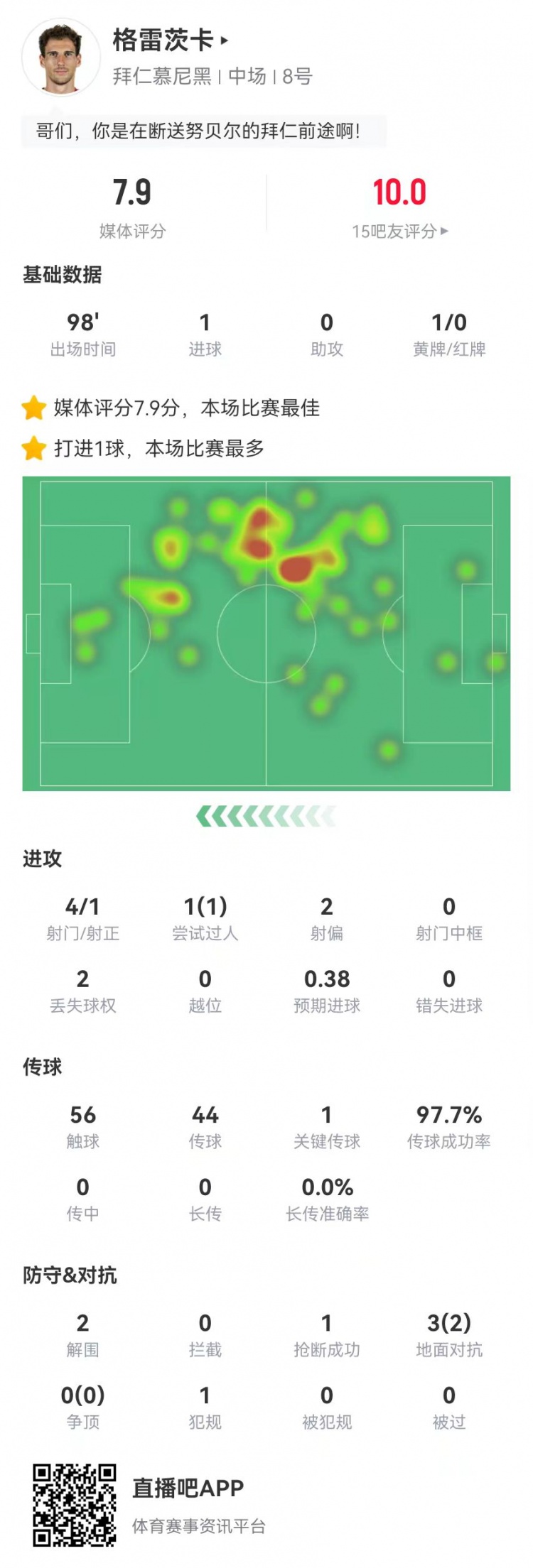 3月1日訊 拜仁在本輪德甲焦點(diǎn)戰(zhàn)3-1擊敗斯圖加特,格雷茨卡本場數(shù)據(jù)如下: